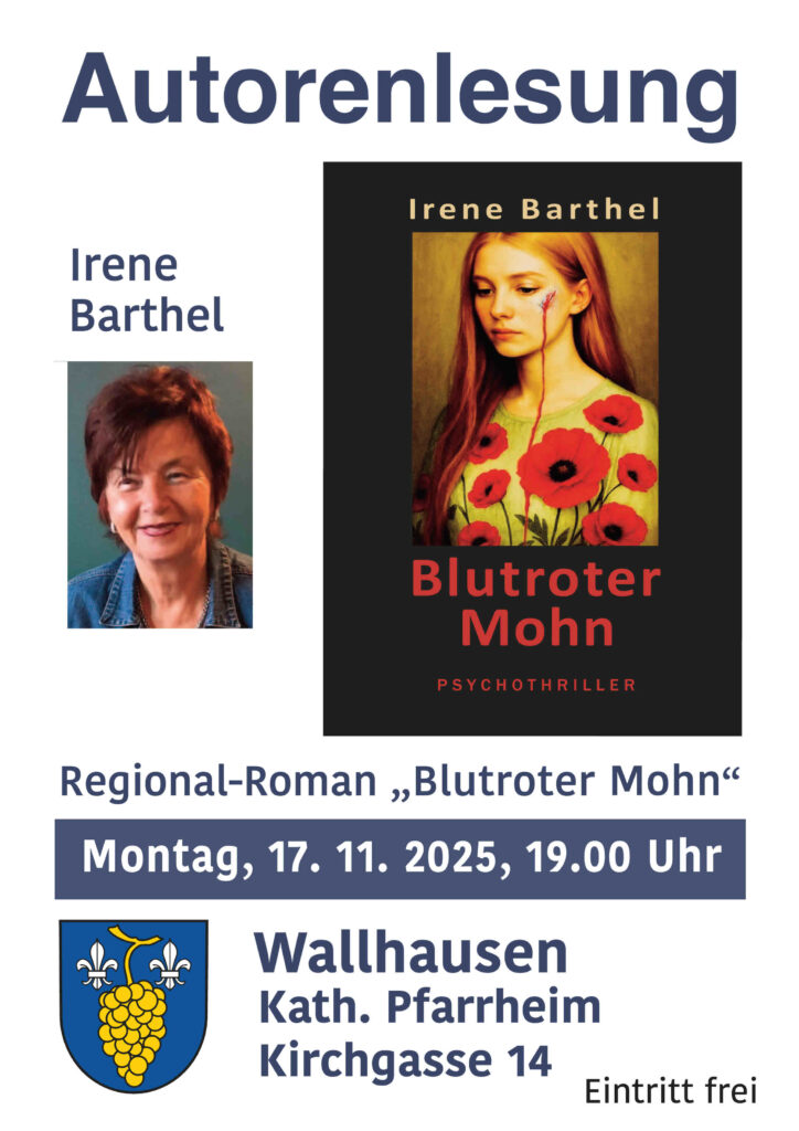 7. November,2025, 15.00 Uhr, Haus der Seniorinnen und Senioren, Mühlenstr. 25, Bad Kreuznach: Lesung aus dem Psychothriller Blutroter Mohn von Irene Barthel